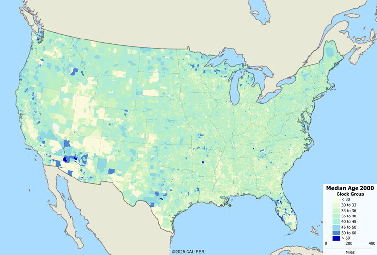 When comparing 2000 vs. 2025 median age by block group, a clear pattern emerges: