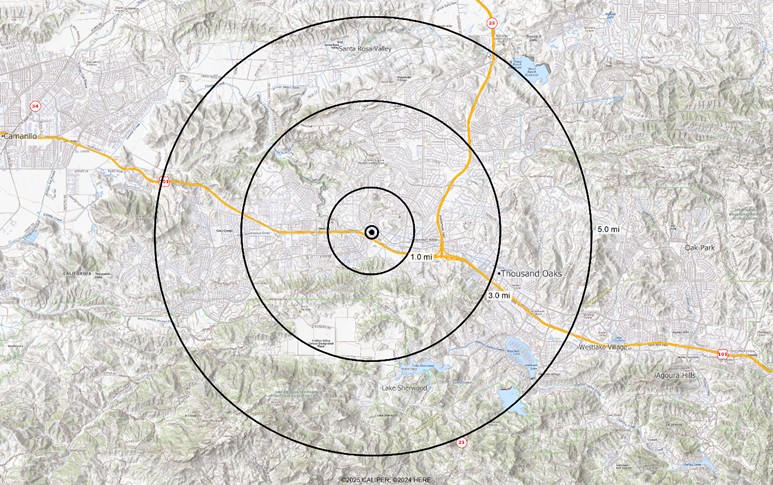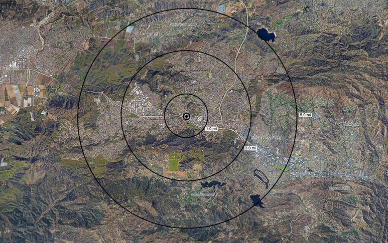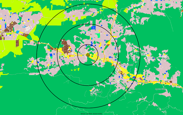 Residential areas are clearly delineated in pink, and the distinction between the commercial zone which follows the Ventura Freeway and the industrial zone to the northwest of the site. To a location analyst considering a city they may not know well, this shows beautifully the layout of the potential trade area.