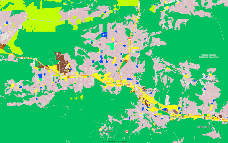 Most of the area land use is either green (natural, agricultural, and parks) or pink (residential). Commercial land use is in yellow, educational in blue, and industrial in brown. Overall, the map is a relatively simple one to interpret, especially for trade area analysis.