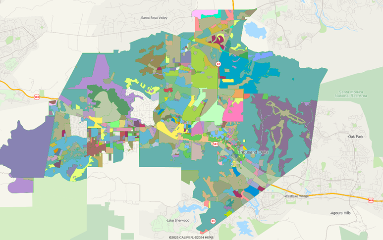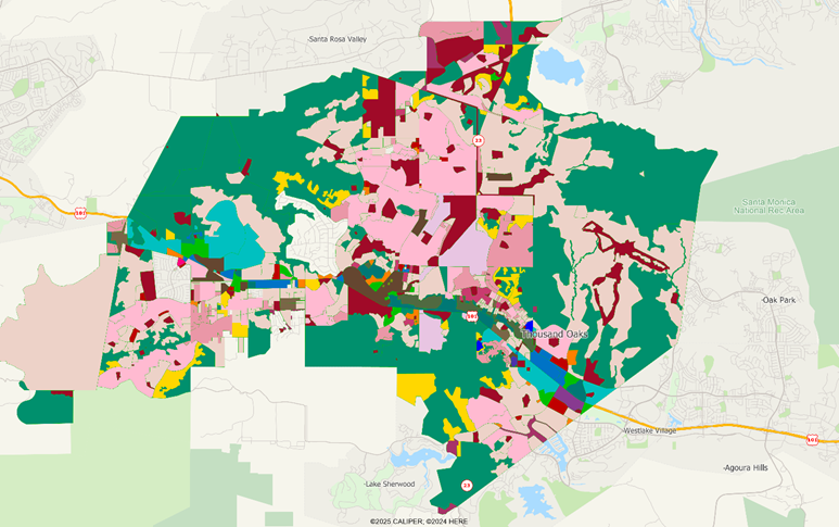 Zoning ordinances were first enacted to minimize conflicts between land uses, such as locating a smelly tannery in the middle of an existing residential area. Over time, these ordinances became increasingly complex through refinement – such as multiple residential zoning areas – and through the granting of exceptions. A map at the same scale shows the major zoning designations used by the city of Thousand Oaks but note that there are areas which are not zoned by the city but instead by the county, as they are not part of the municipal corporate boundaries – users are always reminded that municipal boundaries can be horrendously complex.